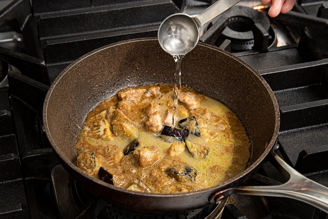 ②火を止めグリーンカレーの素を加える。
