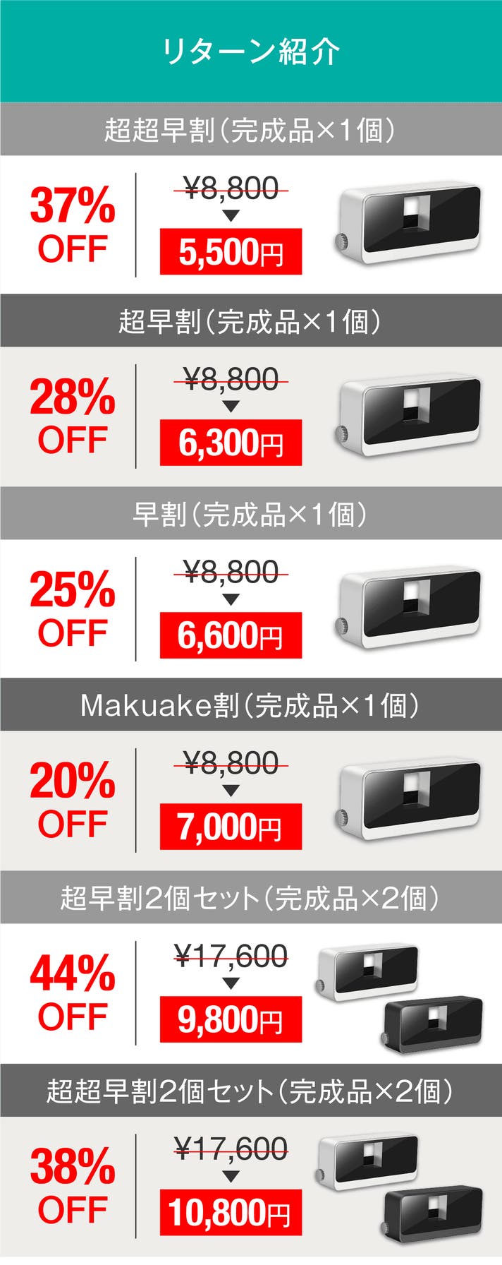 "プロジェクトに関する情報 ・プロジェクトの属性:輸入商品 ・代理店によるサポート:製品保証3ヶ月 ・プロジェクト実行者:日本 ・製品者:中国 ・製造者:中国 ※使用感等に関する返品・返金はお受けいたしかねます。 ※開発中の製品につきましては、デザイン・仕様が一部変更になる可能性もございます。 ※応援購入の数が想定を上回った場合、製造工程上の都合等により出荷時期が遅れる場合がございます。 ※並行輸入品が発生する可能性があります。正規以外での個人輸入等は、完全に防ぐことができない場合がございます旨、予めご了承のほどお願いいたします。並行輸入品は正規代理店による製品保証を受けることができません。また、正規代理店を通じて購入することで、日本国内での流通に必要な各種認証の取得や、関税の適切な処理が担保されます。 ※本プロジェクトを通して想定を上回る皆様から応援購入を頂き、現在進めている環境から量産体制を更に整えることができた場合、正規販売価格が販売予定価格より下がる可能性もございます。 ※本文中に記載させていただいたスケジュールは、あくまでプロジェクト公開時点の予定です。応援購入の性質上、配送遅延のおそれがございます。 ※原則として、配送遅延に伴う応援購入のキャンセルはできませんが、リターン配送予定月から3ヵ月を超えた場合には、希望者に限りキャンセルにて対応させていただきます。 ※一部国内に類似商品が出回っている場合がございます。弊社では他社の類似品に関してのお問い合わせには対応出来ませんのでご了承ください。弊社商品のオリジナル性については、上記プロジェクトに関する情報をご覧ください。"
