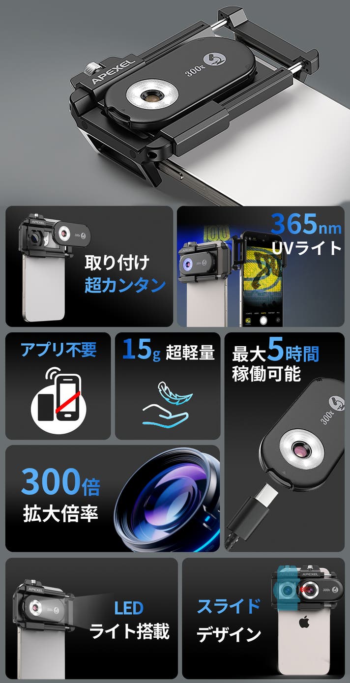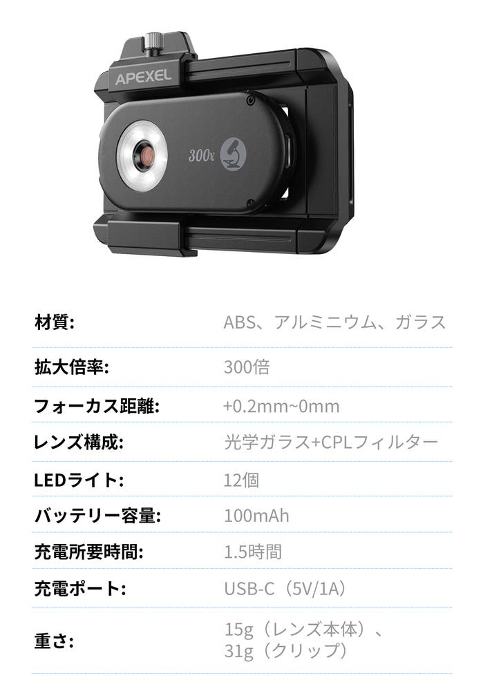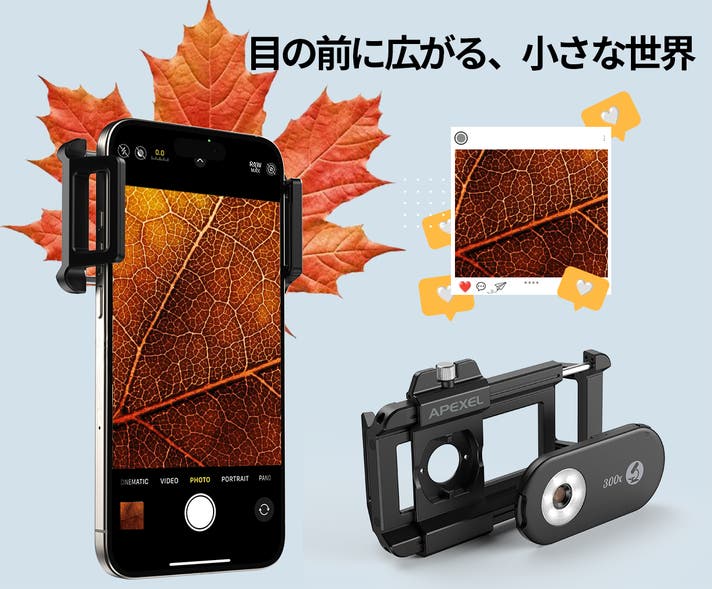 そんなあなたにぴったりなのが、ポータブルスマホ外付け顕微鏡レンズ「PhoneMicro 300X」です!