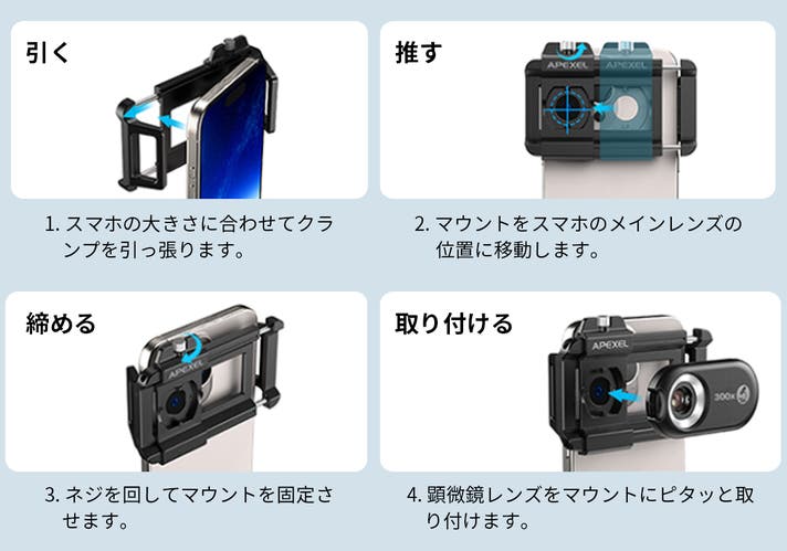 - スマホを一瞬で300倍の顕微鏡に変える!スマホのズーム機能との相乗効果も!