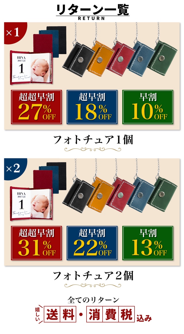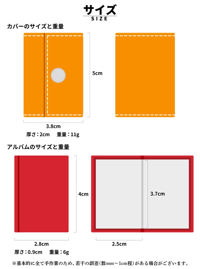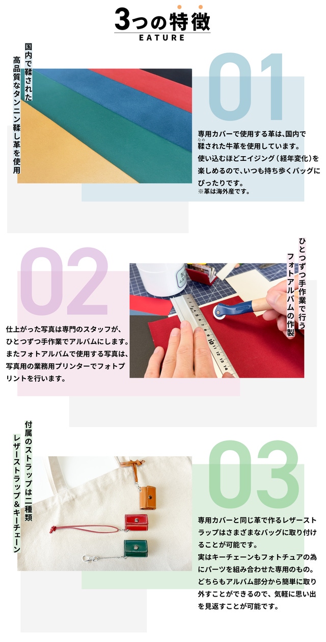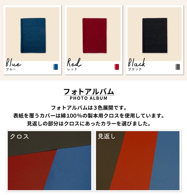 レザーカバーは5色、アルバムは3色の中からお選びいただけます。