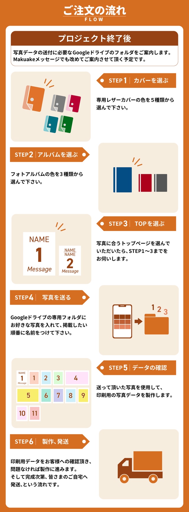 応援購入をしてくださった方へ、プロジェクト終了後に写真送付についてのご案内をMakuakeメッセージにて行います。