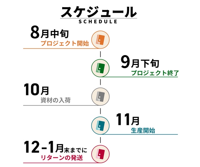 本文中に記載させていただいたスケジュールは、あくまでプロジェクト公開時点の予定です。 応援購入の性質上、配送遅延のおそれがございます。 原則として、配送遅延に伴う応援購入のキャンセルはできませんが、 リターン配送予定月から 6ヶ月 を超えた場合には、希望者に限りキャンセルにて対応させていただきます。 ・デザイン、仕様の一部変更になる可能性がございます。 ・商品の色味は出来る限り実物に近づけておりますが、使用するパソコン、スマートフォン、モニター環境によって、画像の色味が若干異なって見える場合がございます。