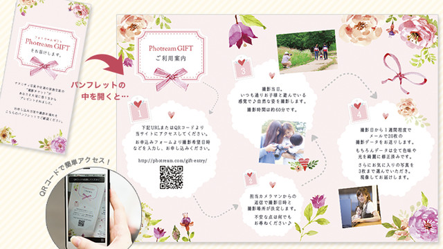 3,ギフトを受け取った方は、フォトフレームに同封されたパンフレット内に記載のQRコードより、写真撮影日程等の詳細をお申し込み頂きます。お受け取り主様のご希望の場所に出張して撮影を行わせて頂きます。
