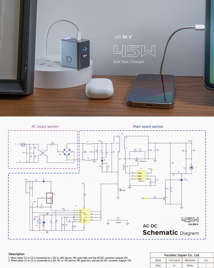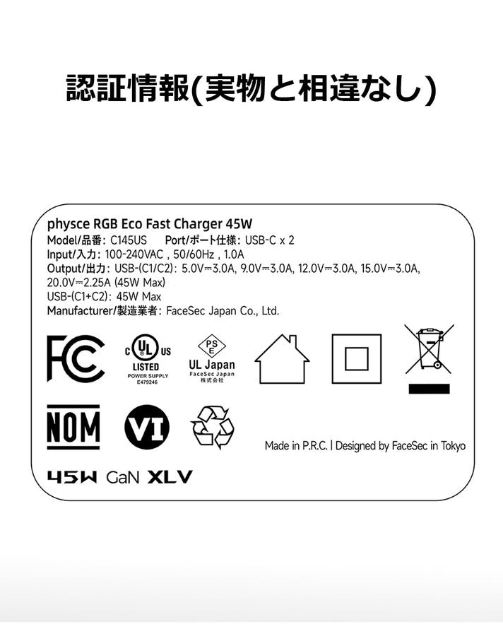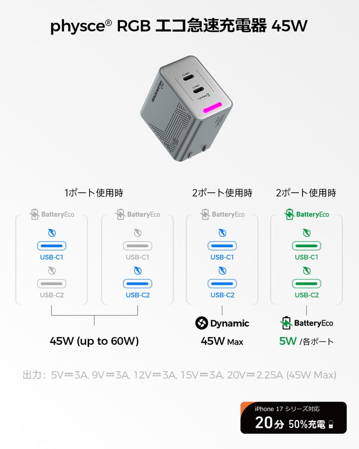 出力: USB-(C1/C2): 5.0V⎓3.0A, 9.0V⎓3.0A, 12.0V⎓3.0A,15.0V⎓3.0A, 20.0V⎓2.25A (45.0W Max)