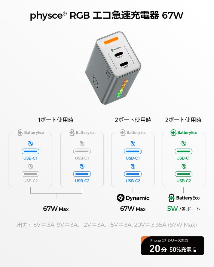 出力: USB-(C1/C2): 5.0V⎓3.0A, 9.0V⎓3.0A, 12.0V⎓3.0A, 15.0V⎓3.0A, 20.0V⎓3.35A (67.0W Max)