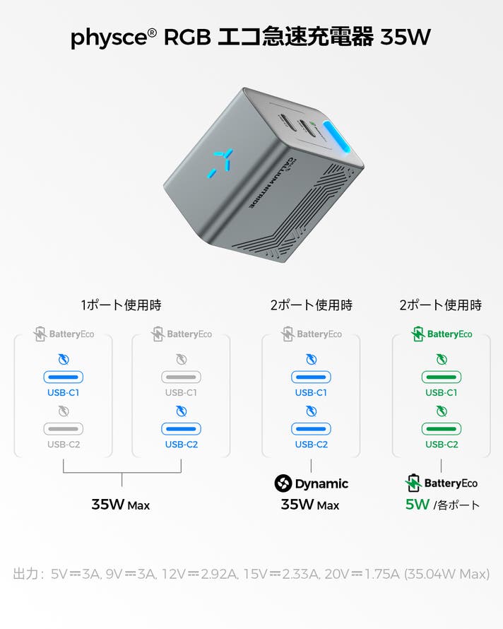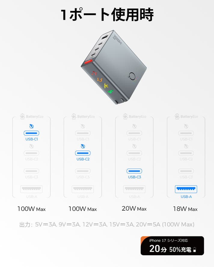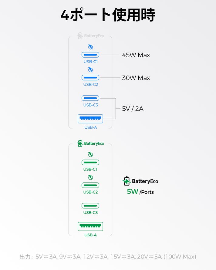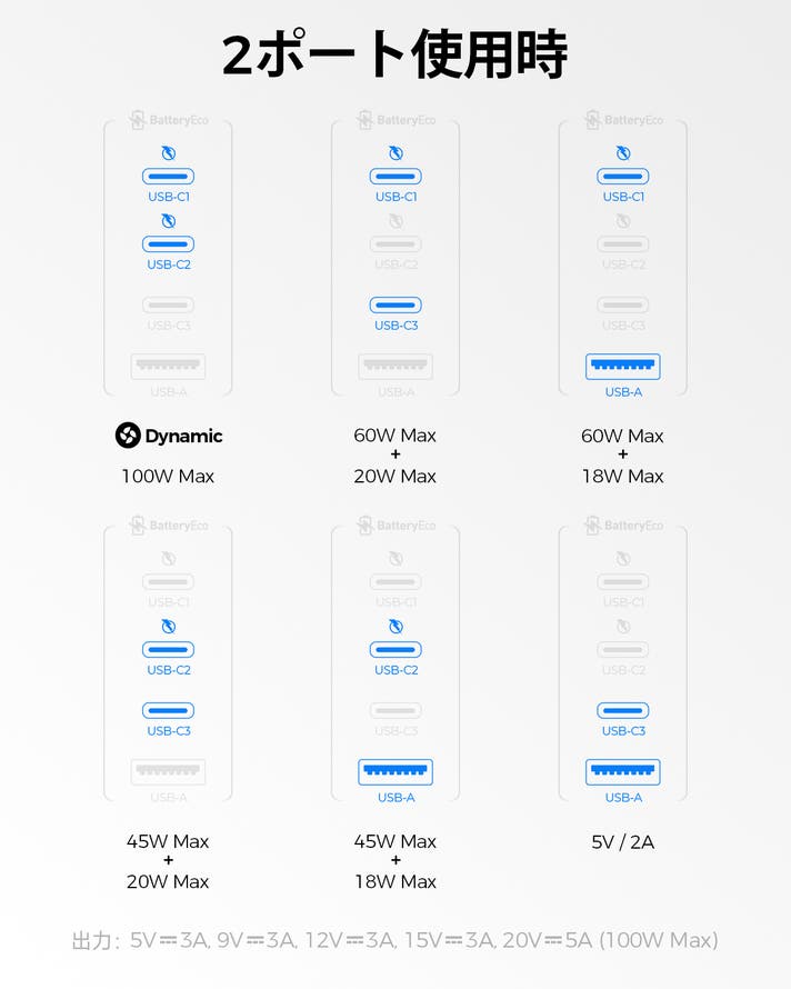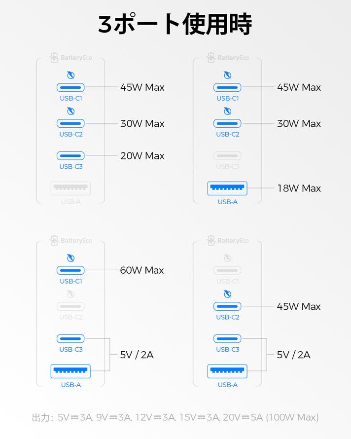出力: USB-(C1/C2): 5.0V⎓3.0A, 9.0V⎓3.0A, 12.0V⎓3.0A, 15.0V⎓3.0A, 20.0V⎓5.0A (100.0W Max)