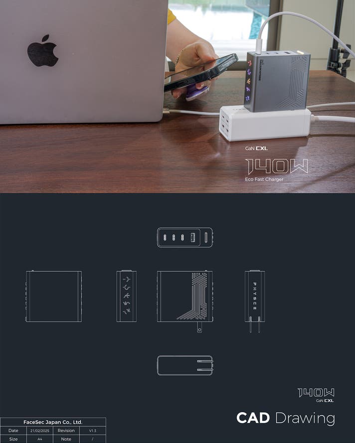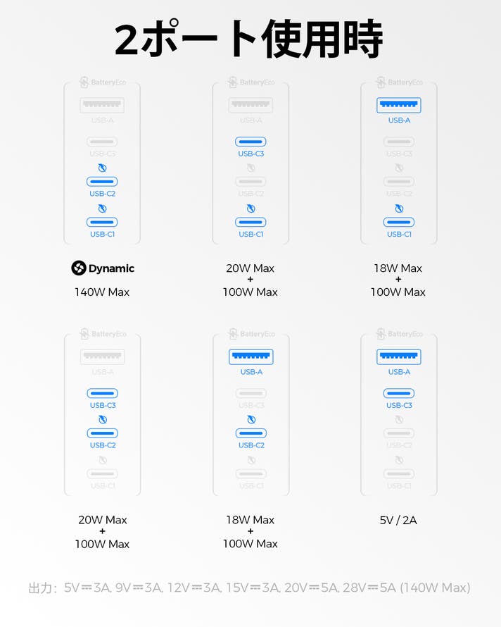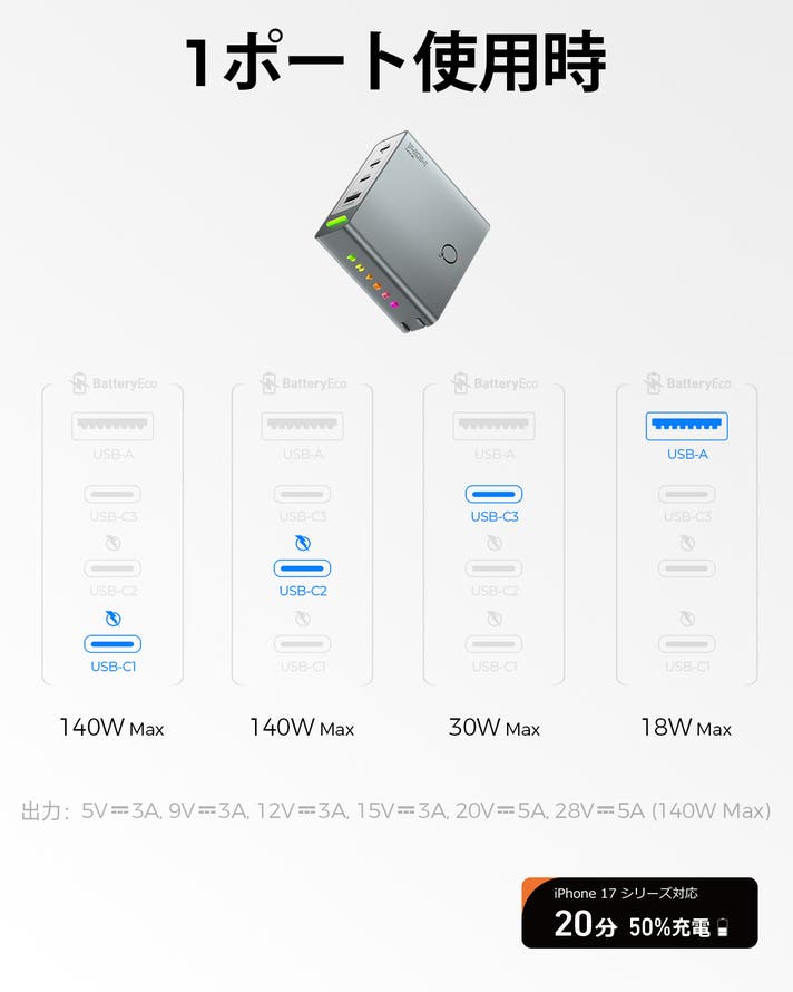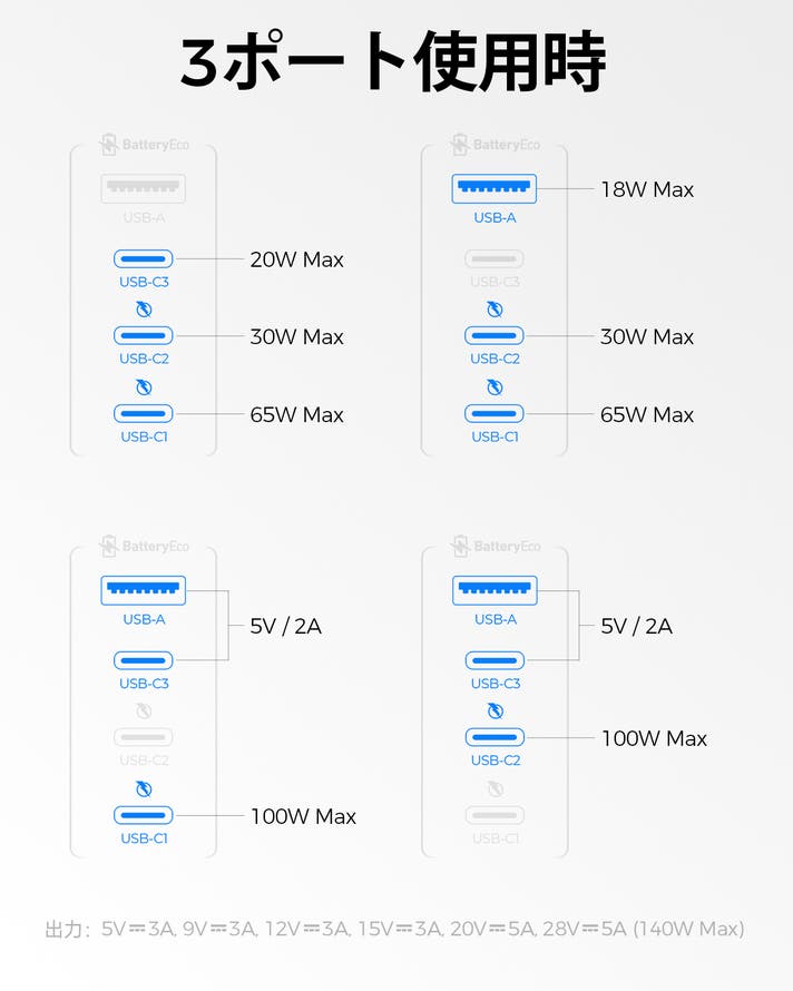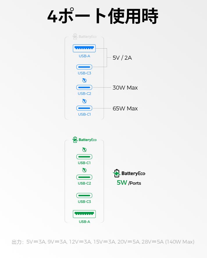出力: USB-(C1/C2): 5.0V⎓3.0A, 9.0V⎓3.0A, 12.0V⎓3.0A, 15.0V⎓3.0A, 20.0V⎓5.0A, 28.0V⎓5.0A (140.0W Max)
