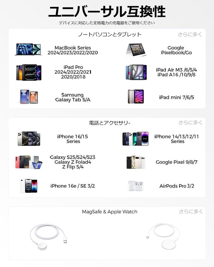 A. 45W・67W・100W・140WモデルはAppleのダイナミック充電技術に対応しています。充電速度はiPhone 17やiOS 26のバージョン、使用環境によって変動しますが、最新のiPhoneでも安心してお使いいただけます。