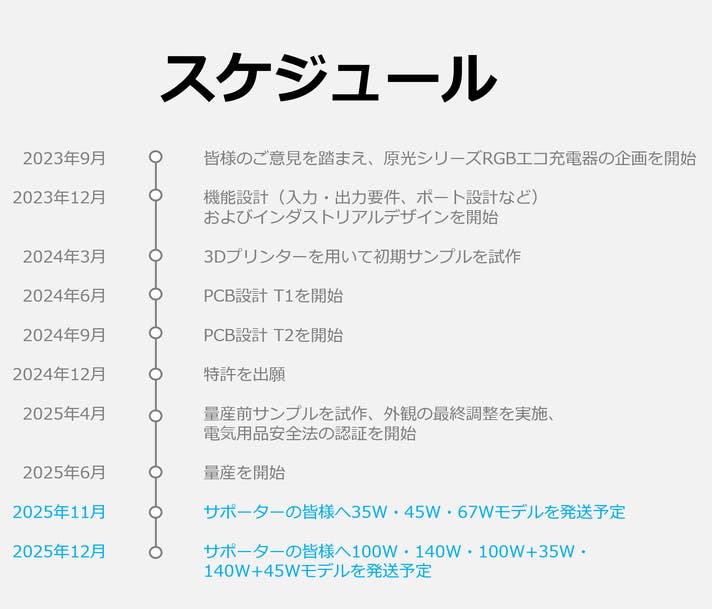 A. 35W・45W・67Wモデルのリターンは2025年11月中、100W・140W・100W+35W・140W+45Wモデルのリターンは2025年12月中の発送を予定しております。進捗に変更があった場合は、活動レポートにて随時ご報告いたします。