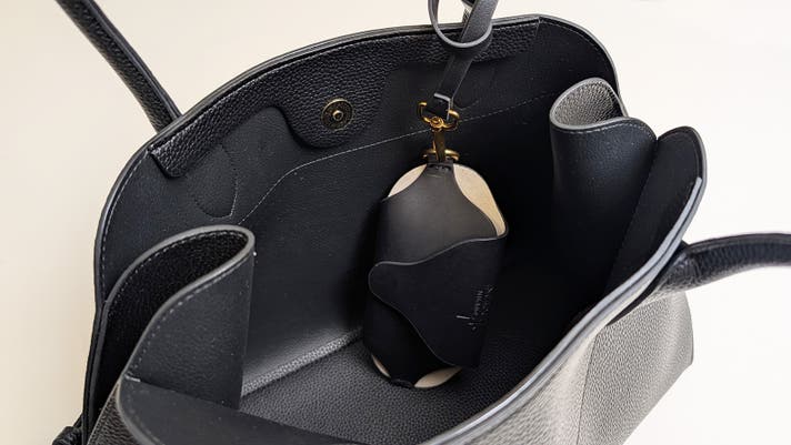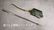 首から下げてアクセサリーのように持ち歩ける長いストラップ(*オプション)と、バッグのハンドルやベルトループに取り付け可能な短めのストラップ(*付属)。