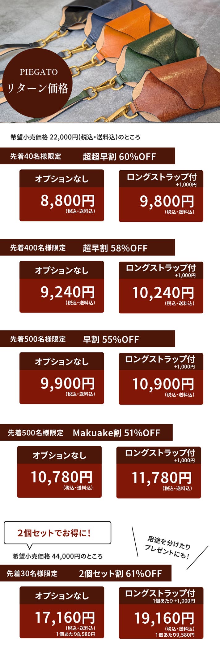 一般販売予定価格 22,000円(税込・送料込)のところ、Makuake先行特別割引 最大60%OFFにてお届けいたします。
