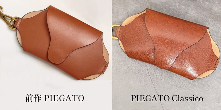 前作のPIEGATO では、一般的にヌメ革と呼ばれる伝統的なレザーに近い、