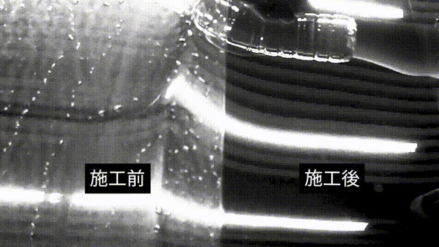 施工後(左側):水とボディの接地面積が小さくなり、滑るように水が流れるようになります。