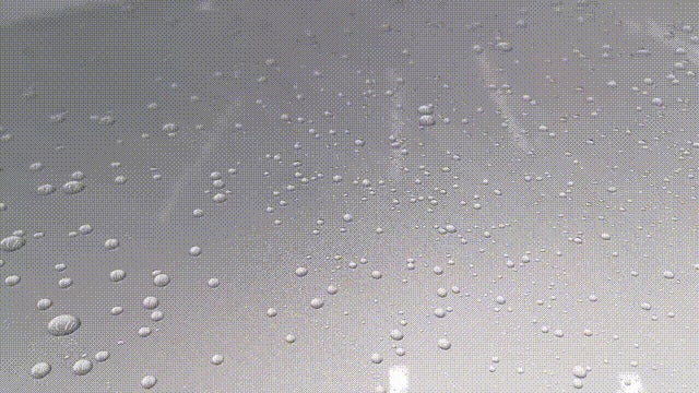 施工前(右側):水とボディの接地面積が大きく、水弾きせず水の幕がペタッと広がるような状態です。