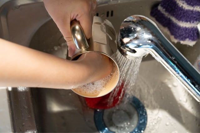 熱いお湯を入れたタンブラーに重曹をスプーン1杯入れ、約30分間置いてください。