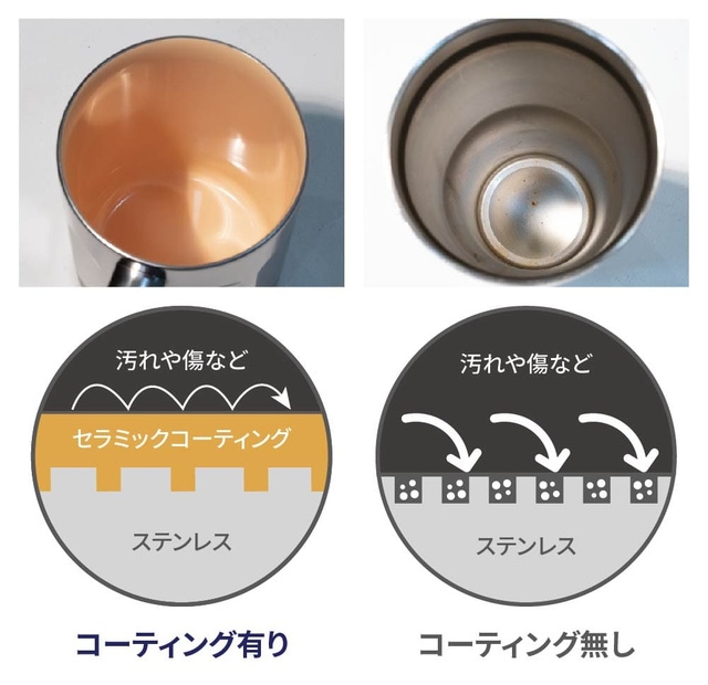 そしてセラミックコーティングのおかげで細かい汚れや傷などがつきにくく、ドリンクのニオイや色がうつりにくくお手入れも楽です。