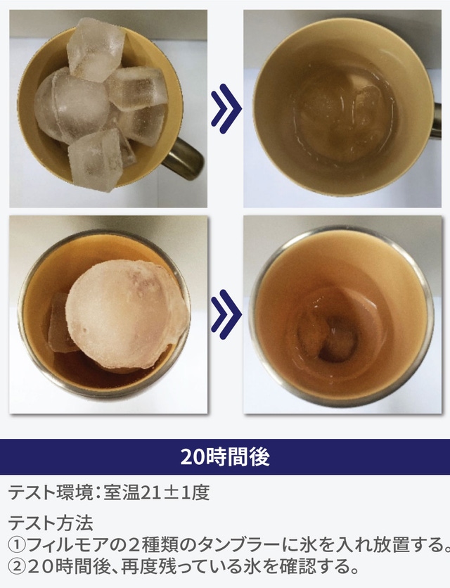 また、専門機関を通じて室温21度で行いましたテストでは20時間たっても氷が全て溶けずに残っていることが分かりました。