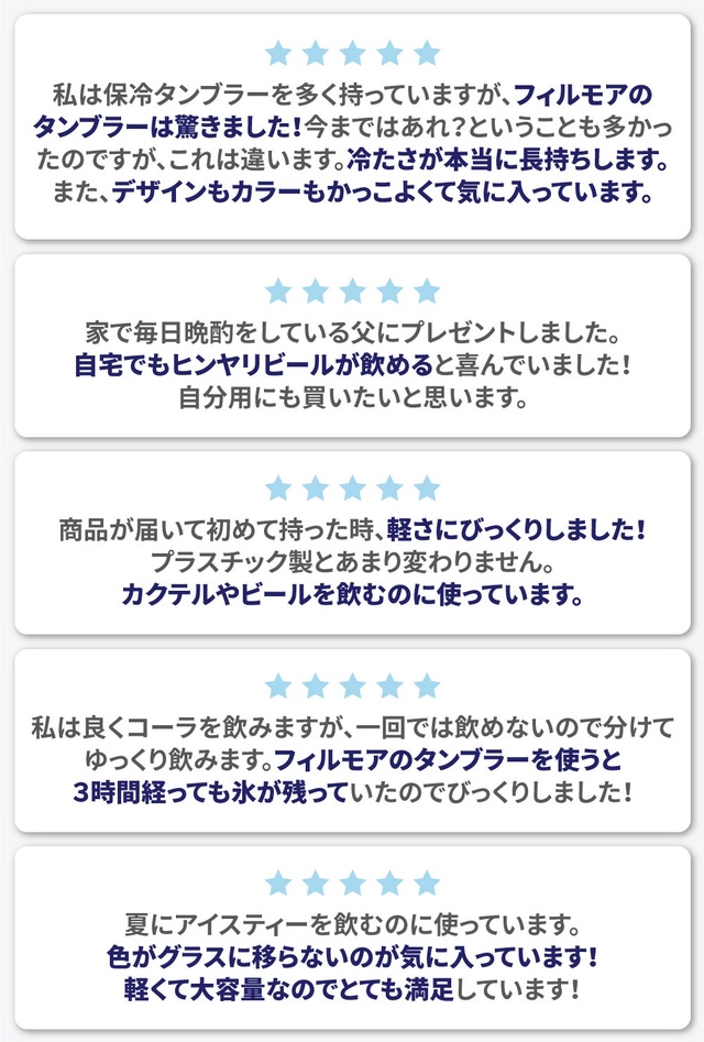 ・この商品を輸入しようと思った理由:デザインも良く、二重構造で長い間冷たく飲めるフィルモアのタンブラーを皆様にぜひご紹介したいと思いました。