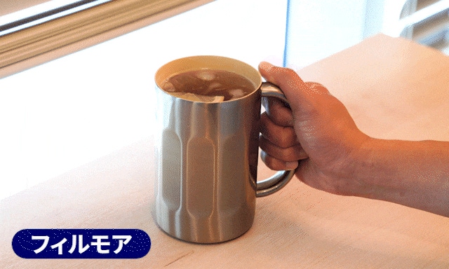 その分、フィルモアのタンブラーは二重真空構造で冷たい飲み物に触れている部分とタンブラーの外側の部分が真空になっているので外側の表面は冷たくはなりません。