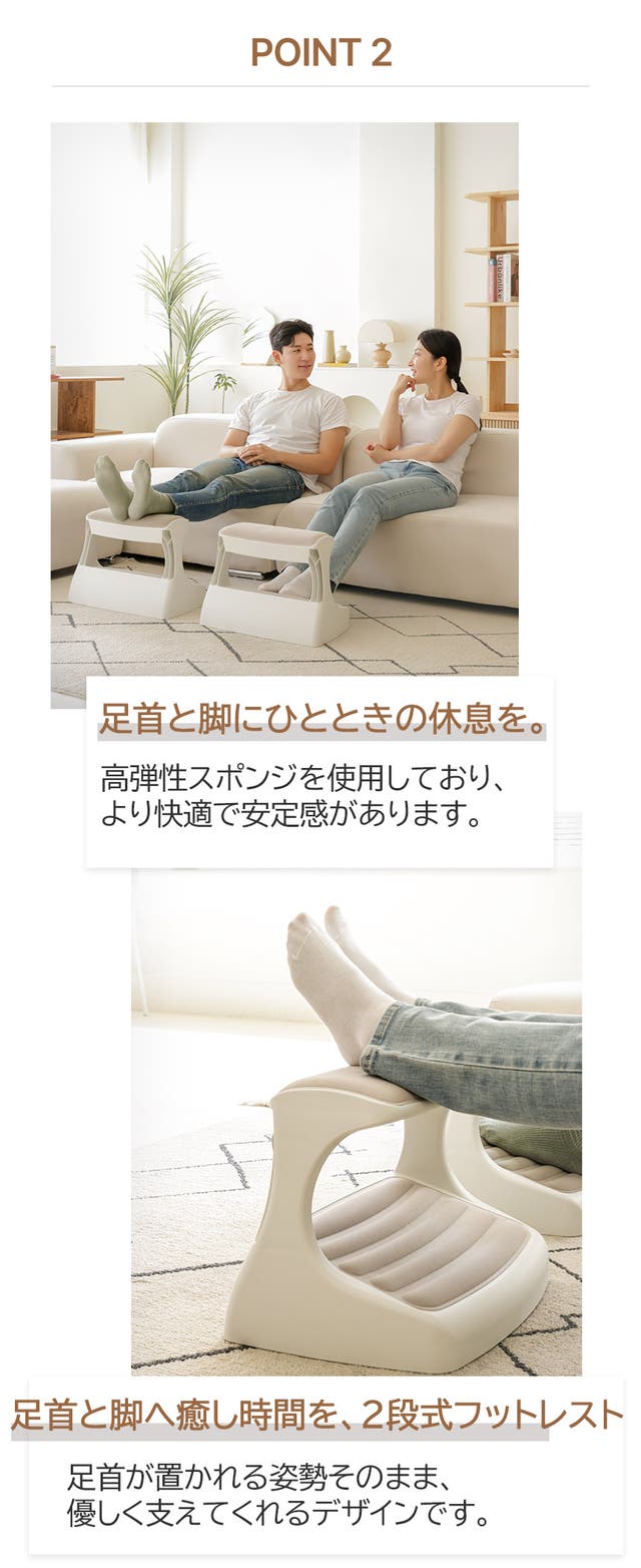 - 足の休息のための2段式フットレスト ! 足首が置かれる姿勢を優しく支えてくれるデザインです。