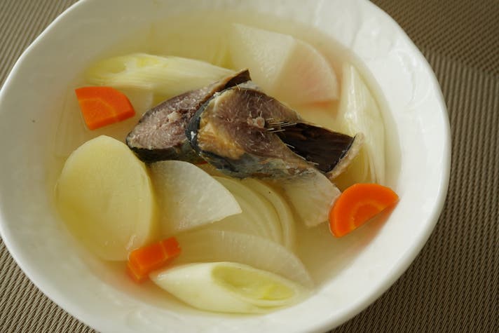 ▲糠ニシンの三平汁は、糠ニシンの塩分を利用して塩を極力少なくし、薄めのだしでつくるのが基本。煮るほどに、ニシンの旨味と野菜の甘みが一体化してコク深く仕上がる