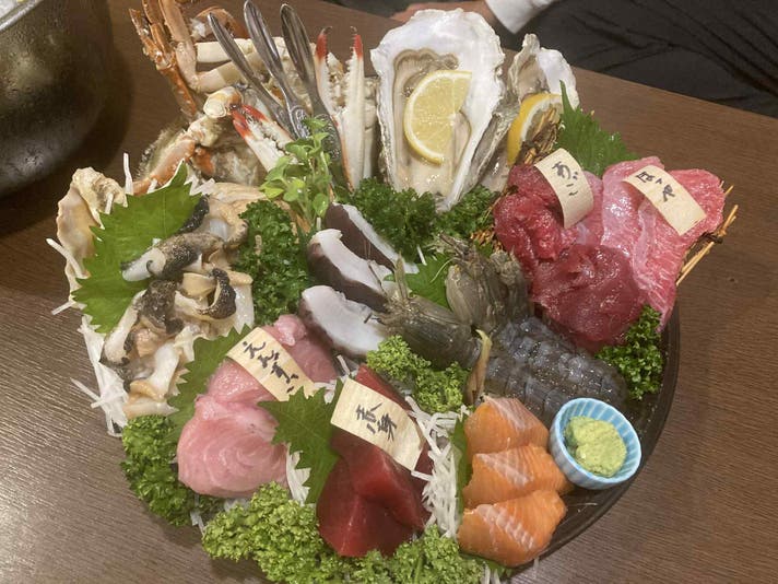 ▲お店の名物は、刺身盛り合わせ。石狩の海で獲った魚のほか、全道の漁師仲間から届く新鮮な魚が並ぶ。漁師ネットワーク、恐るべし