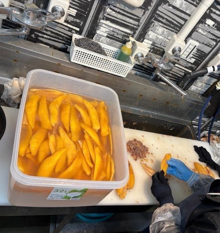 ▲下山夫妻が、新鮮なニシンを手ずから加工したからこそ、黄金に輝く数の子に仕上がる