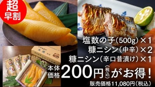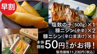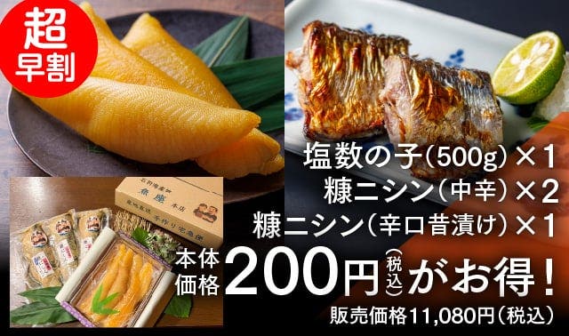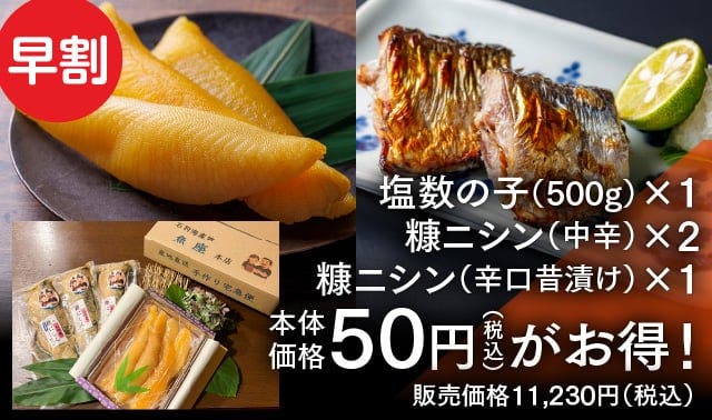 【早割】石狩産「ジャンボ塩数の子(500g)」&「伝統の味・糠ニシン(中辛×2尾、辛口昔漬け×1尾)」 11,230円(税込)60セット