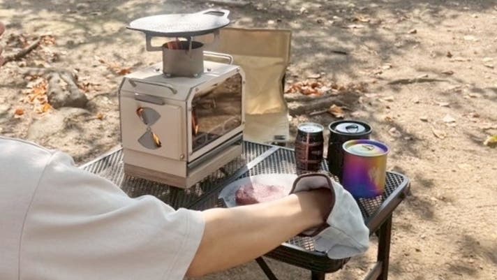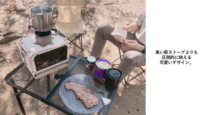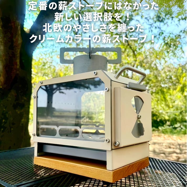 これまでの薪ストーブといえば、重厚感のあるブラックやアイアンカラーが定番でした。そんな中、この製品は屋外でのキャンプはもちろん、自宅のバルコニーやテラスでも美しく映える、新しいデザインとなっています。