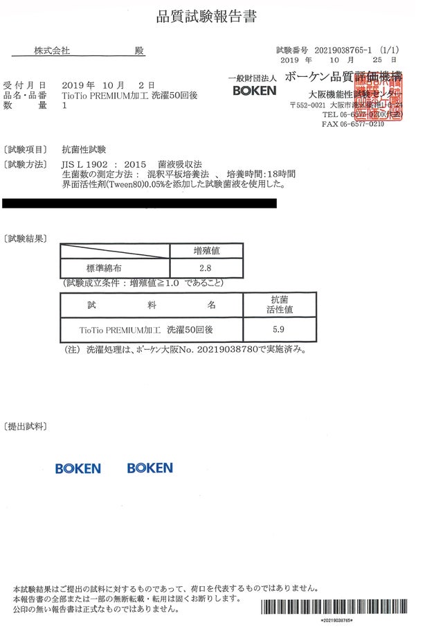 *ハイブリッド触媒TioTioプレミアム加工は、SKEマークと抗ウイルス加工マークの認証を受けた実績がありSKEの登録加工剤になっています。(登録番号K079A)