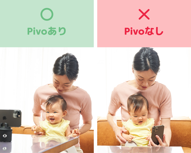 Pivoはジンバルのように手で持つ必要はありません。机の上において、両手が空いた状態で通話ができるため、小さな子どもを抱えた状態でも会話に集中できます。