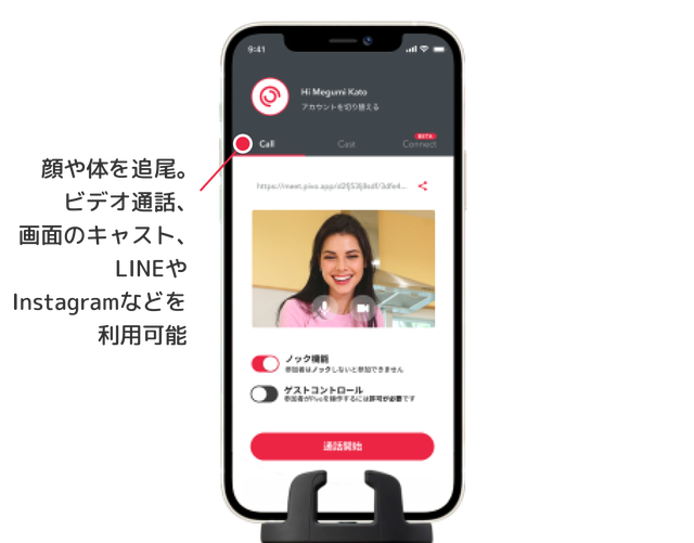 ビデオ通話に参加者を招待したり、画面をパソコンにキャストしてPivoをWebカメラのように使用できます。また、LINEのビデオ通話やInstagramのライブ配信でも活用できます。