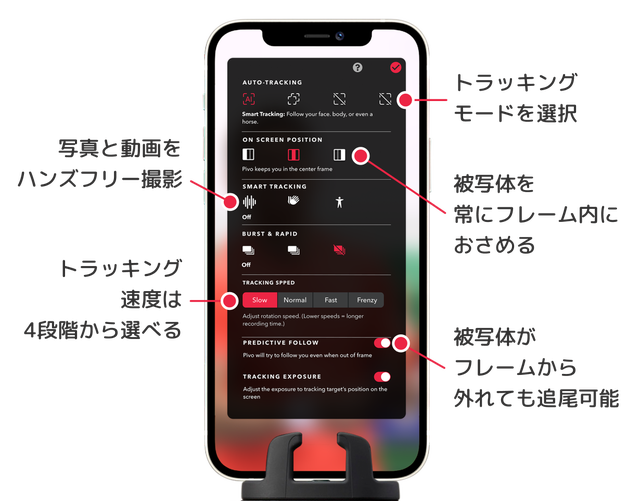 トラッキング速度やモードも、アプリで自由に変更できます。