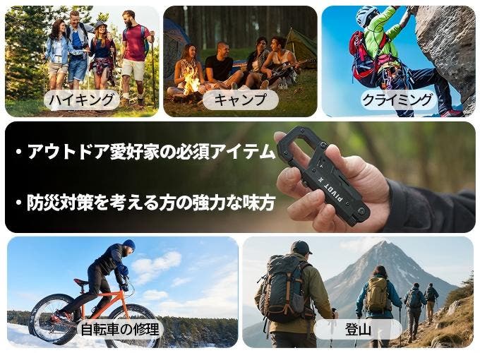 「Pivot X」は、アウトドアから日常まで、あらゆるシーンで頼りになる相棒です。キャンプ場での設営、自転車の緊急メンテナンス、ピクニックでの食事、あるいは災害時などの緊急事態。5つの機能が、あなたの冒険と日常を、より安全でスムーズにします。