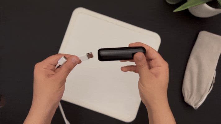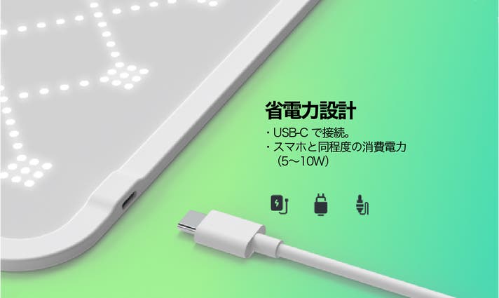 PixmatはUSB-Cで電源につないで使います。バッテリーを内蔵していないので、本体は軽く、持ち運びもラク。