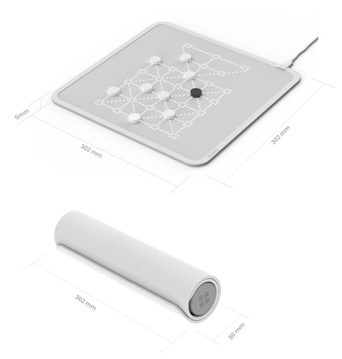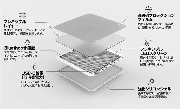 独自のフレキシブルLEDボードが、直径8cmのペットボトルサイズにクルッと収納。広げれば30cm×30cmのフルサイズ盤面に早変わり。