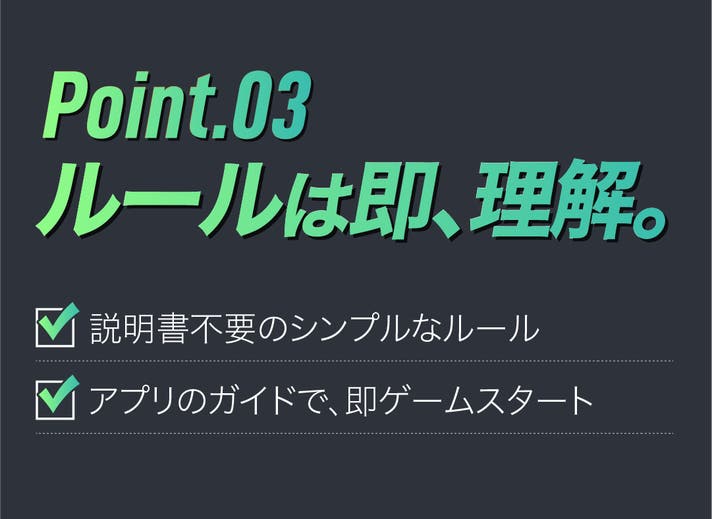 - スマホで直感操作。説明書不要のシンプル操作で、1人でも家族・友人とでも集まった瞬間すぐ遊べる