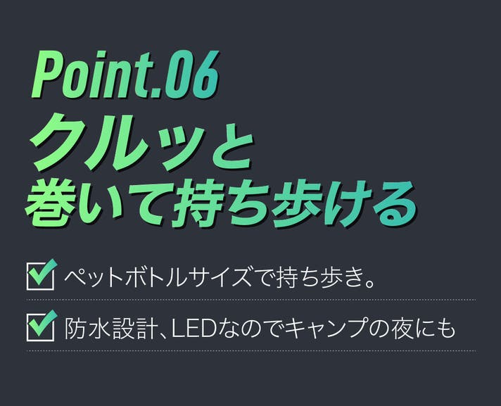 - ペットボトルサイズで持ち運び&防水設計。旅行、移動中の車内、夜のキャンプでも本気で遊べる