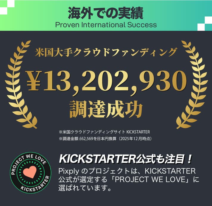 Pixplyは米国大手のクラウドファンディングサイトKickstarterでも大注目のプロジェクトとして開始し、大成功を収めています。それだけではありません。