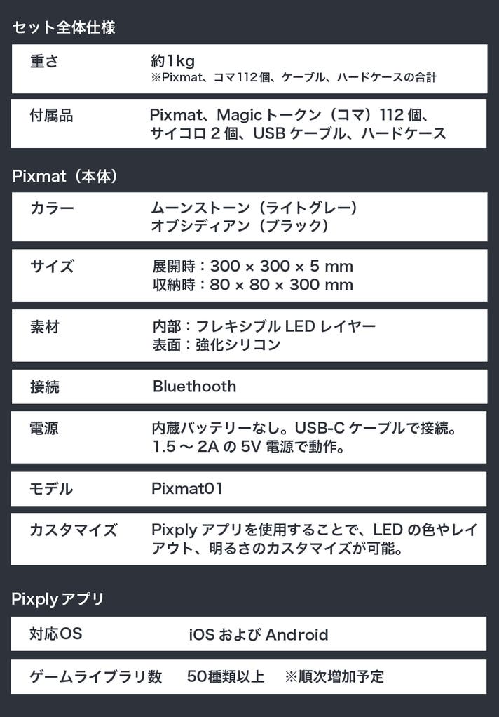 Pixmat(本体)はライトグレーの「ムーンストーン」、黒の「オブシディアン(黒曜石)」の2色が選べます。
