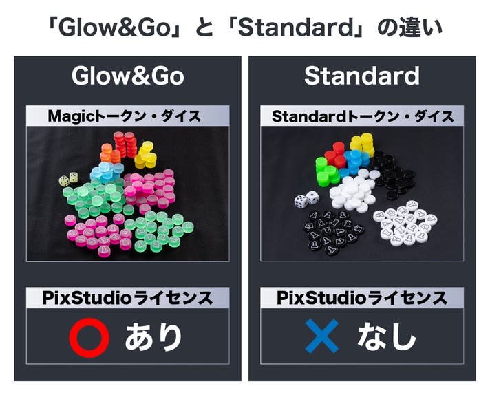Glow&Goセットは半透明のMagicトークンと自信で盤面を自由に作成できるPixStudioライセンスが含まれているセットになります。