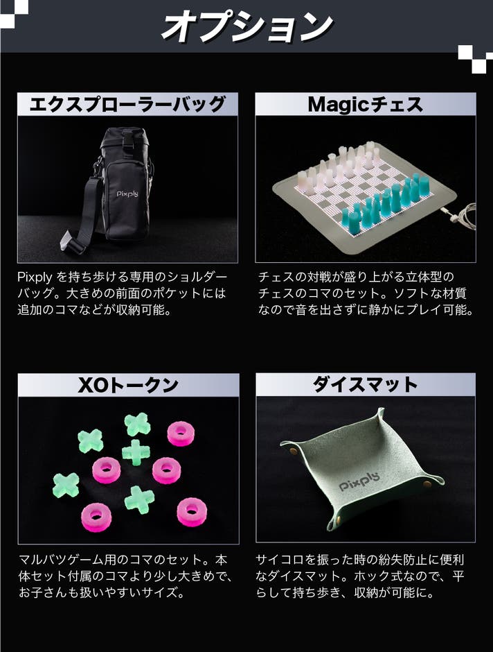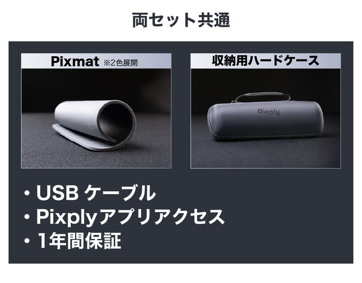 今回は、Pixplyの本体セット2種類と、遊びの幅が広がるオプションをリターンとしてご用意しています。