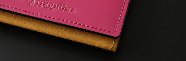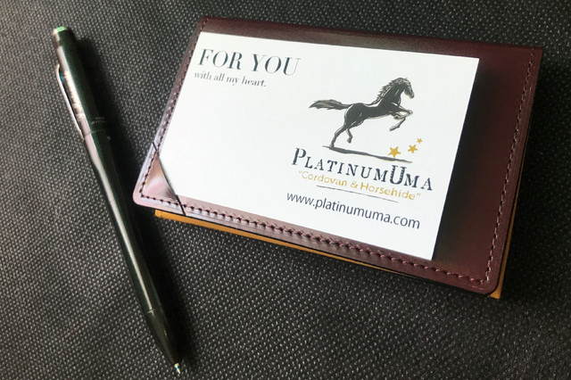 ホースハイド(馬の臀部以外の革)は、ヌメ革と違い、経年変化が少なく、購入時の風合いを保つ素材です。一般的なコードバンアイテムでは、例えば名刺ケースの裏側部分には異なる素材の革を使用することが多いですが、今回の名刺入れでは、表も裏(内装)も革は全て馬革。本物を追求するPLATINUMUMAのこだわりです。