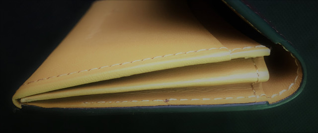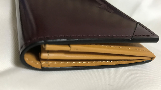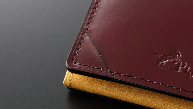 名刺ケースの左隅にもうけたこのスリットは、単に斜めに切れ込みを入れているわけではなく、名刺ケース本体の上からコードバンを縫い合わせた仕様。こういうオリジナルデザインはスタンダードではない為、百貨店などのショップでは、なかなか商品化されません。