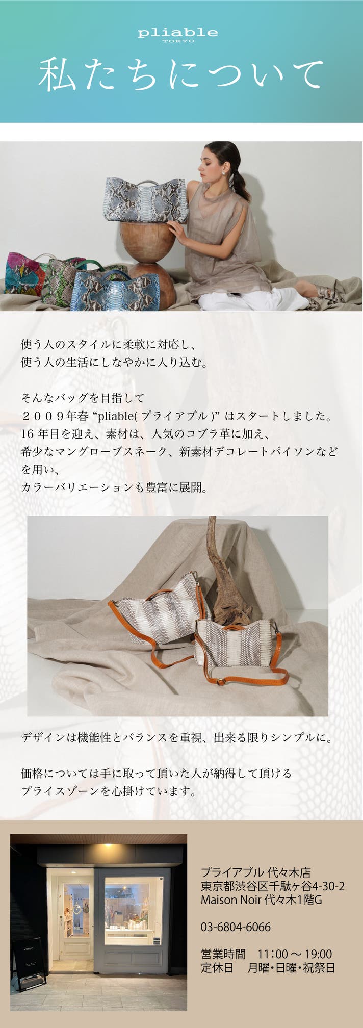 幣社は2009年よりオリジナルの爬虫類バッグブランド「 pliable / プライアブル 」を展開しております。