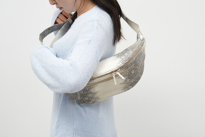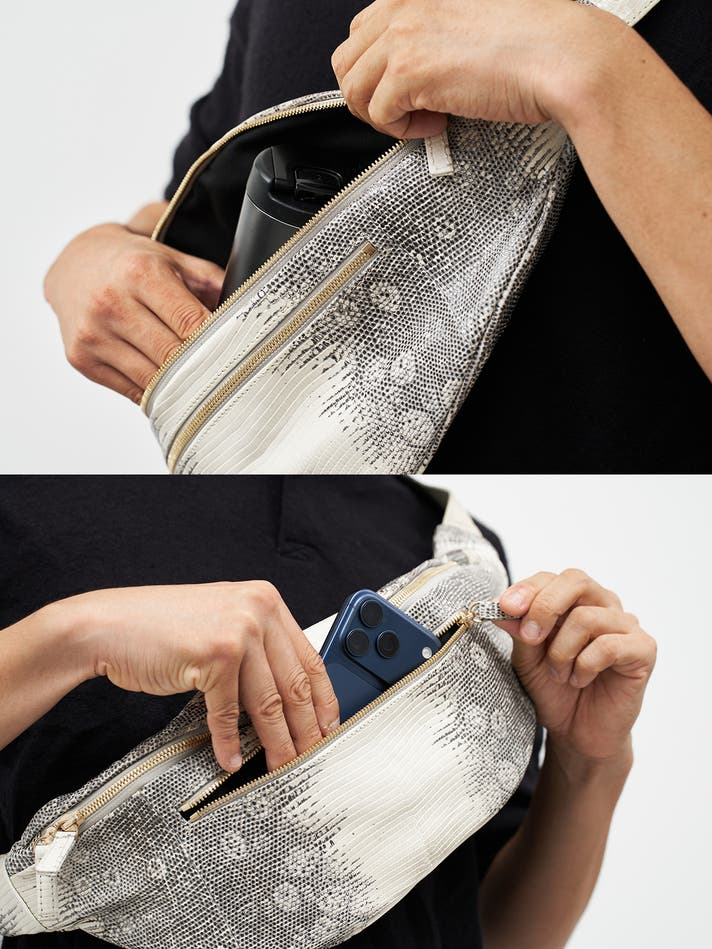 使用しているリングトカゲ革は、東南アジア産のミズオオトカゲ由来。 背部に現れる輪状の斑紋と粒状の鱗が、際立った立体感を生む。