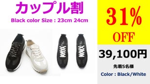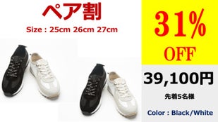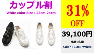 カップル割は1足を23cm/24cmのどちらかをセットで購入していただき、もう1足は25cm/26cm/27cmの中からお選びいただきます。