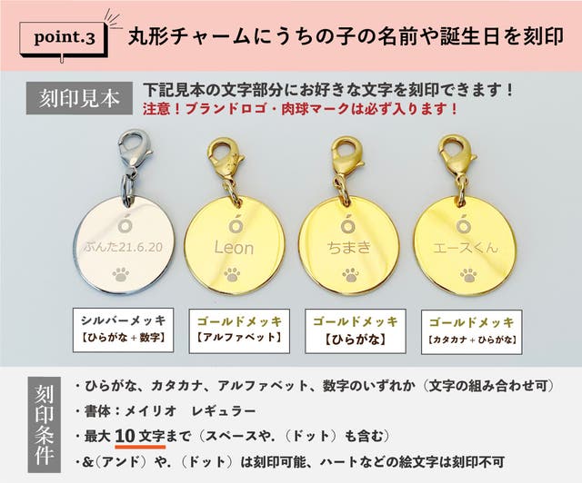 - 大切なうちの子のお名前や誕生日を丸型チャームにレーザー刻印!!