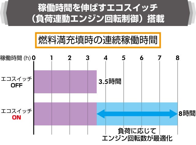 『エコスイッチ』を搭載しているので、スイッチを入れエコモードで運転すると使用電力に応じてエンジン回転数が自動的に変化。最適な回転数で運転します。これにより燃費を抑え、より長時間の稼働を実現します。
